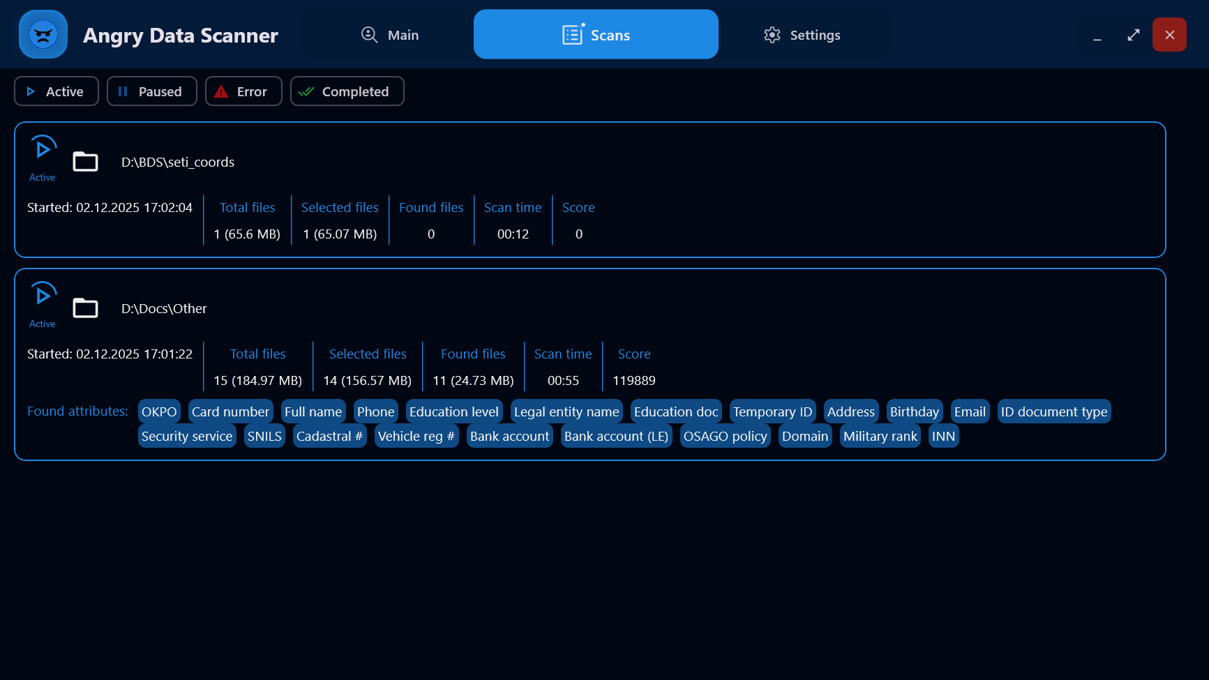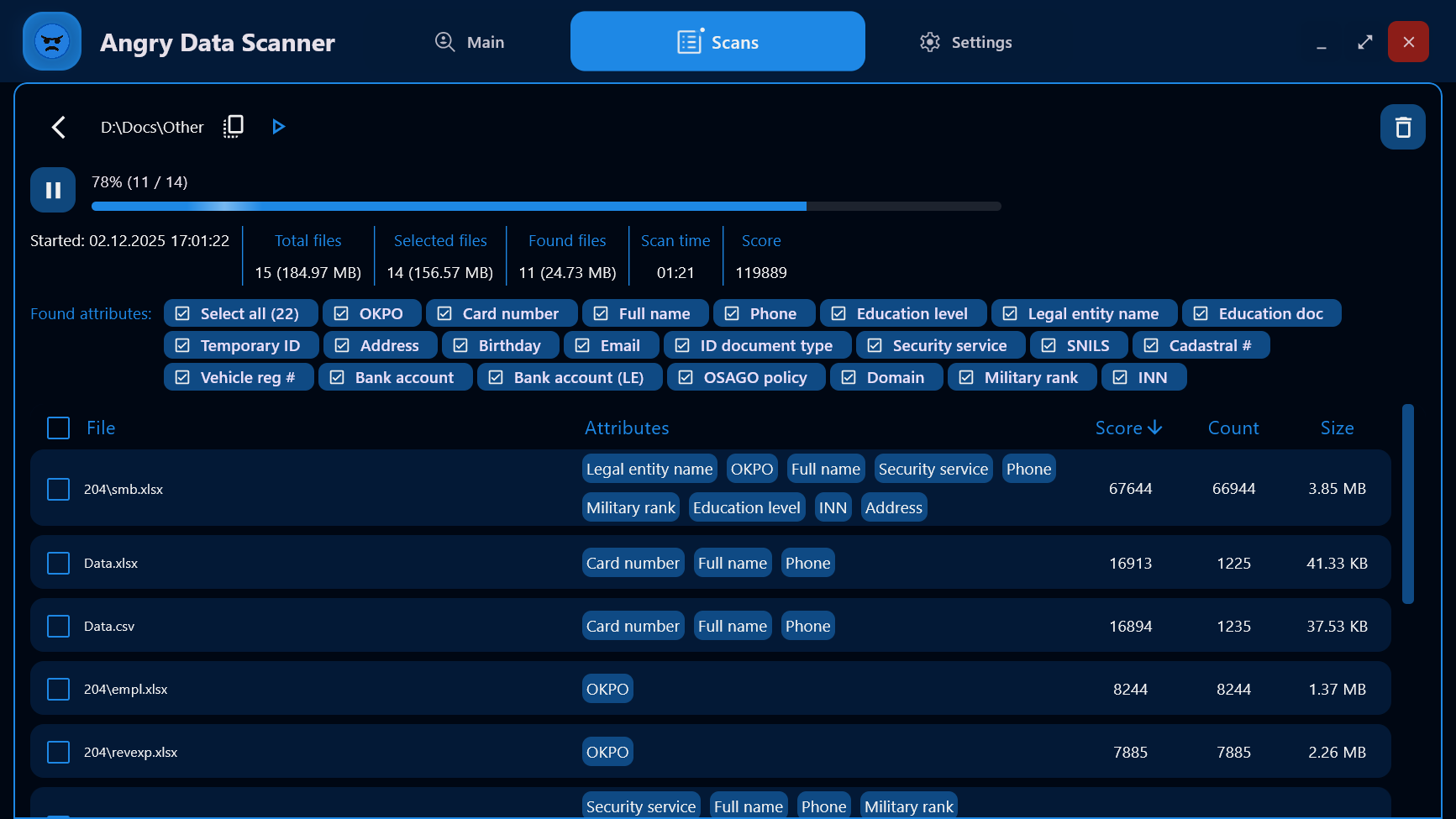 Angry Data Scanner is a sensitive data discovery tool that uses pattern matching to automatically discover sensitive data stored in folders, web pages, S3, database. It helps organizations by identifying where sensitive data such as personally identifiable information (PII) and intellectual property is stored. The tool provides visibility where your sensitive data is stored.
